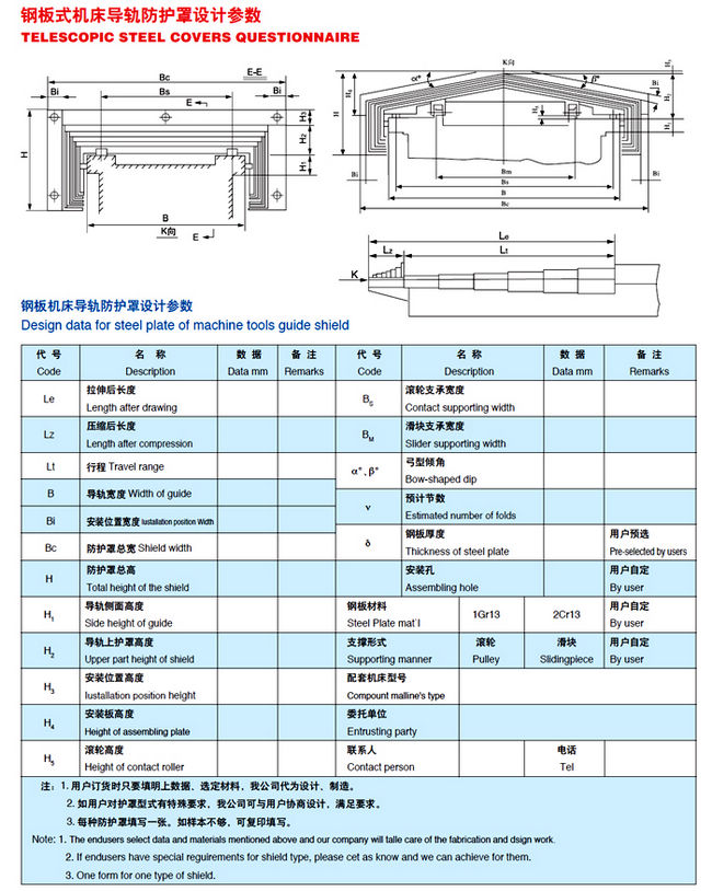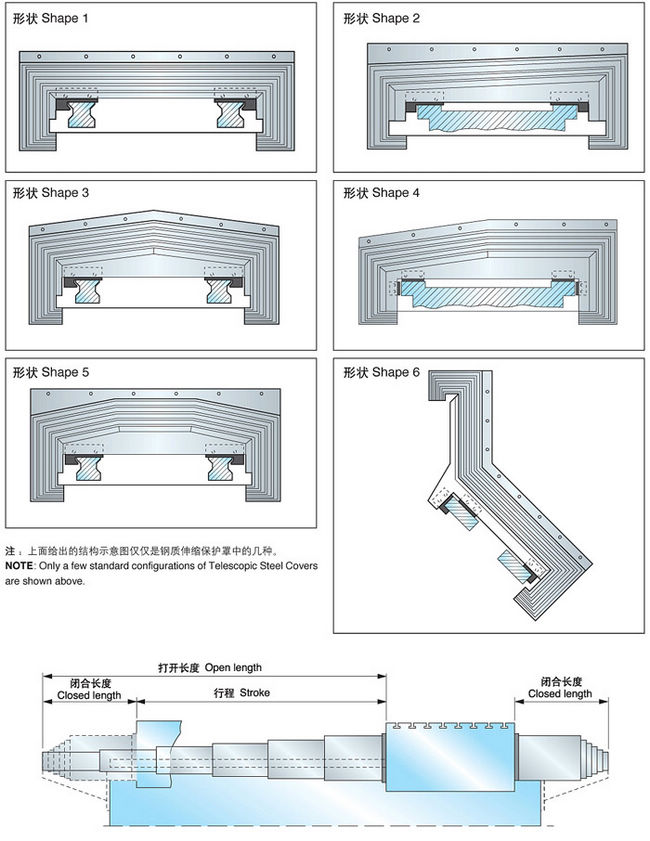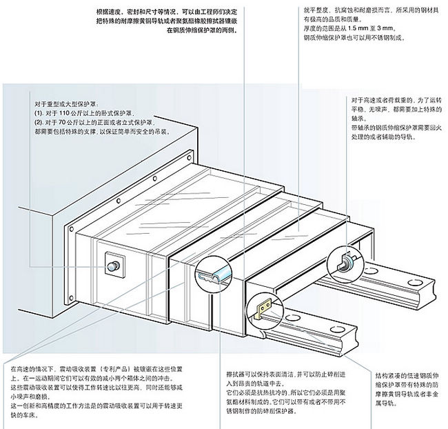 钢板伸缩式导轨防护罩每层钢板端部装有弹性密封垫,可在运动时清洁钢板表面。伸缩防护罩可水平和垂直使用,运行速度可达60m/min,可按用户的不同要求设计。提供平板型、拱型的,也可提供圆形、八角形的。产品参数:可定制