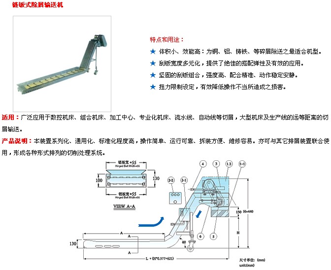 本装置系列化、通用化、标准化程度高,操作简单、运行可靠、拆装方便、维修容易。亦可与其它排屑装置联合使用,形成各种形式排列的切削处理系统可处理各类切屑;也可作为冲压,冷墩机床小型零件的输送装置。输送效率高,输送速度选择范围大;链板宽度多样化,结构形式分为无缝链板和有缝链板两种。流线造型,美观大方,排屑顺畅。具有过载保护功能。